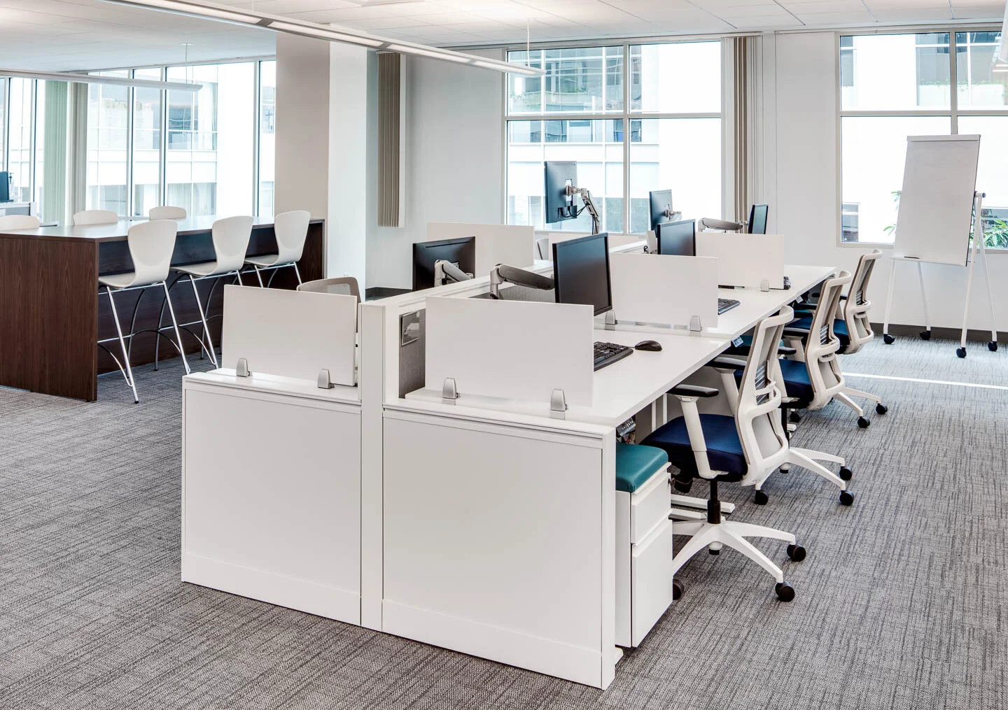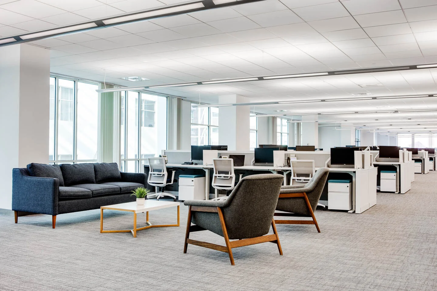Of course, to give them the space that they and their interior designers envisioned was a lot easier said than done. First of all, we had to remove over 600 existing workstations from their space. Then deliver and install approximately 600 new adjustable benching stations to replace them. Next, came furnishing all the seating areas. This included task seating, lounge seating, and seating for collaborative work. Not to mention the conference rooms, cafés, and every other kind of space you can imagine fitting into 105,000 square feet. Three months later, they had the space they were looking for. And we had another successful installation under our belt.
